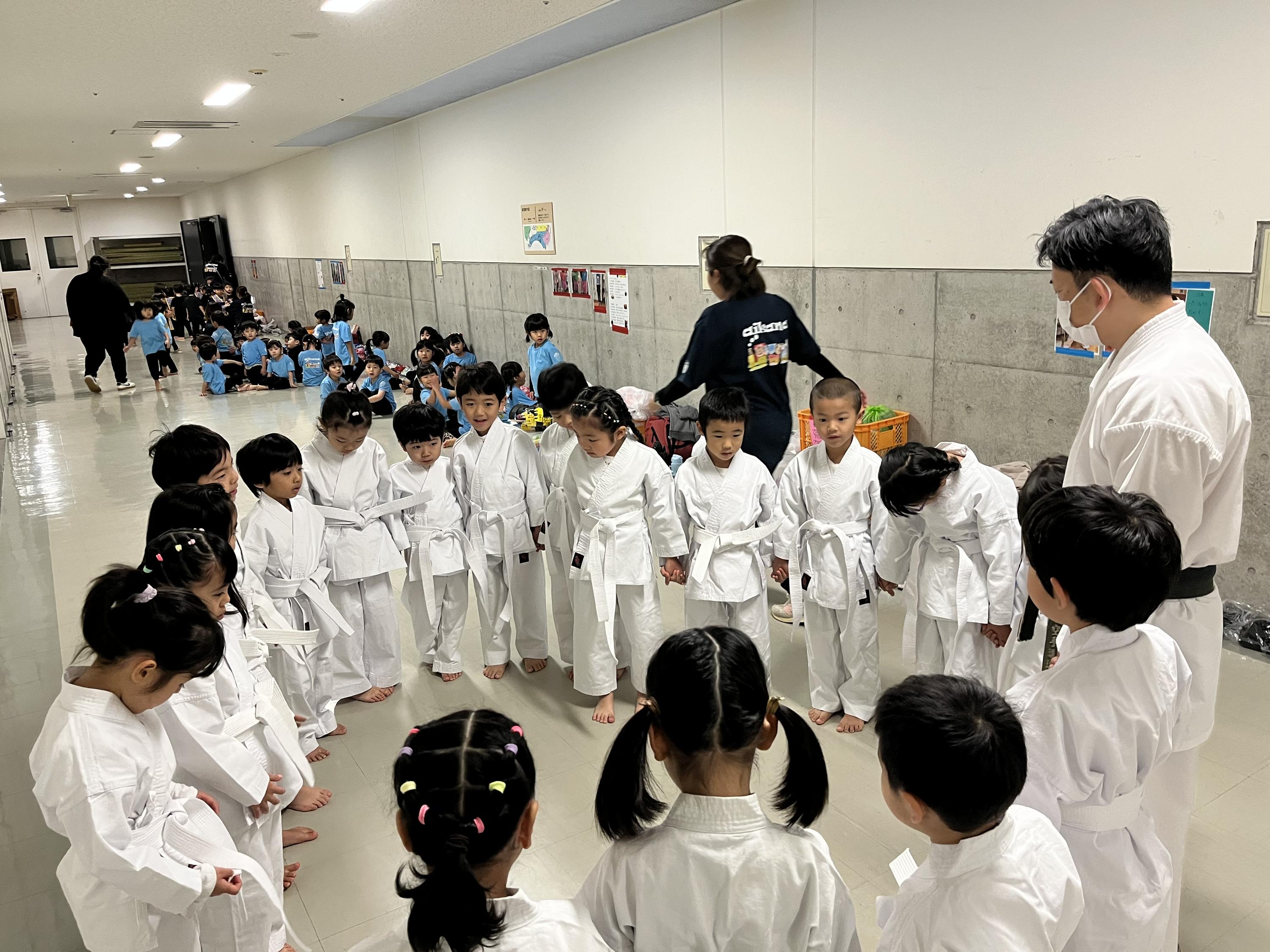 木村先生と一緒に円陣を組み、気合を入れるらいおん組さんは