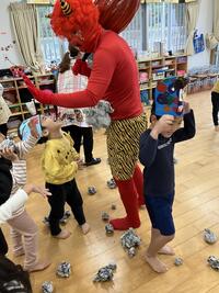 みんなの力強さにおにさんも新聞紙豆をたくさん投げつけられて