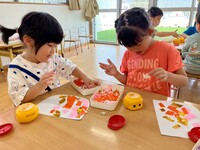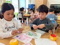4歳児クラスは自分達で折り紙をちぎって糊で貼り合わせ、