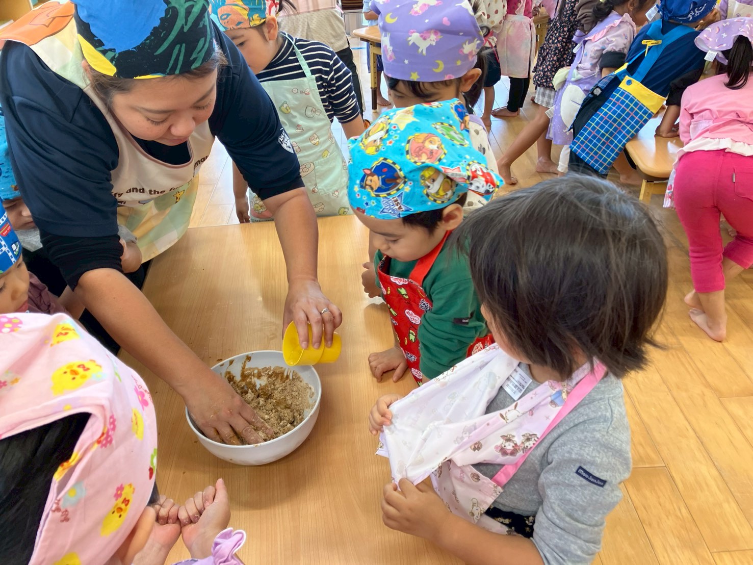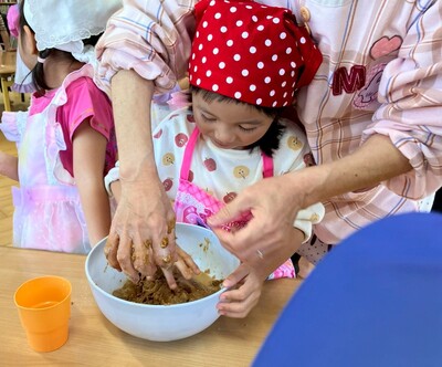 お友だちとも協力し「今 水入れて良い?」や「5回こねたら 交代ね」と話合う姿も!